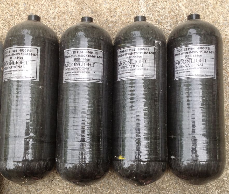 2. 4ea Carbon Fiber/Aluminum wrapped cylinders. Not intended for diving. 4500 psi rating, fits (loosely) 3/8" HP valves. These tanks are scary, and extremely bouyant. Have a use in mind for them, and don't call me later about them. Even I didn't use them long for diving, if that tells you anything. No DOT records. Original certificate expired. $25 each, $75 for all four.