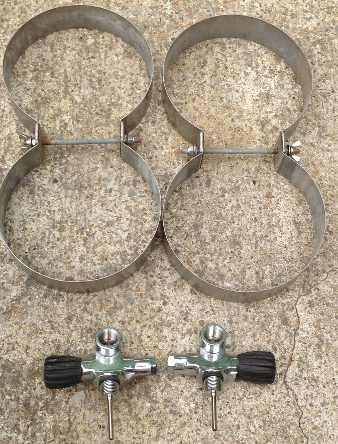 5. Bands and Manifold- One set of stainless steel 8" tank bands, no bolts. Welded plate type, not crappy spot welded thing. Good solid bands. $45. 3/8" HP DIN Left and Right valve with plugs for sidemount. $75 for both.
