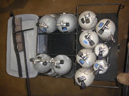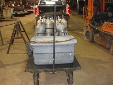 This dive cart is built to hold eight Al 80s, two sets of dubbles, two scooters, and has room for fins mask,etc. All the tanks and scooters can be straped into place. With two handels on both ends that are removeable for convenance. The cart has 10" wheels two riggied and two swivels. Dimenstions are 60.25" long x 36.375 wide. The top of the floor sits 16" high and the top rail sits 35" high. Works great for dives like fredmans. One person can Handel it or two. It fits in the truck upside down and holds the tanks in place in the bed. No room to keep it any longer. Asking 300.00 if interested pm me. Not looking to ship but I can deliver to north fl.