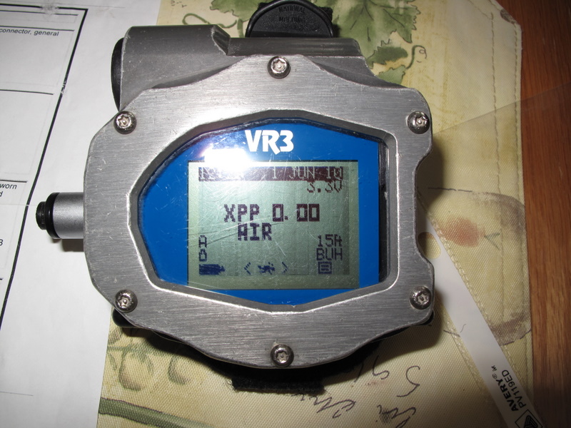 VR3 monochrome dive computer for sale. Full open/closed circuit trimix with external PO2 monitoring pin's activated. Buhlmann algorithm only.