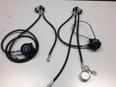 Scubapro Mk17/G250v primary and Mk17/r395 backup with Scubapro SPG. All serviced in 2012. Comes with all hoses (mostly halcyon lp hoses, 1 miflex drysuit inflator hose), bolt snaps, etc.