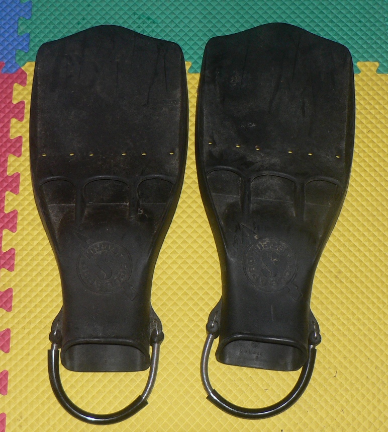 The XL is about 3-4 years old, has spring straps and used maybe 15 times in fresh water only. This size fits my 11 size foot wearing 5 mil wet suit booties.