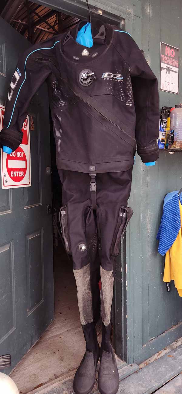 A Waterproof D7, excellent condition. Bob was 6 ft and 160 lbs and size 11 foot. The suit was loose on him. It has latex seals, seem fine and one spare wrist seal in the drysuit bag, included. Asking $900