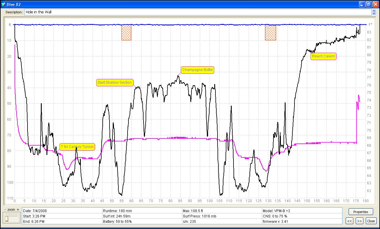 Had the whole cave to ourselves. Scootered upstream to 1,250p and parked scooters. Took the right at the T for the Century Tunnel. This is one of my favorite cave passages. It starts looking like JB towards the middle and is around 100ffw. Swam to London Bridge and Big Ben (3,650p). Awesome scenes. Everything was going smoothly so we continued for the Champagne Bottle (another ~2,000 feet). Got to the shallow section (~30ffw). Be careful not to rip your suit here. Made it to the Champagne bottle in 80 minutes. Showed 9 minutes of NDL when I touched the bottle (due to burning deco in this shallow section). It appears that there used to be a sink hole where the line ends here. Shook hands and signaled for our turn around. The water is also signficantly warmer in this entire section. I noticed the colder temps when making my way back through the Century Tunnel. Reached the scooters and zipped back to the cavern where we had 10~20 minutes of deco.